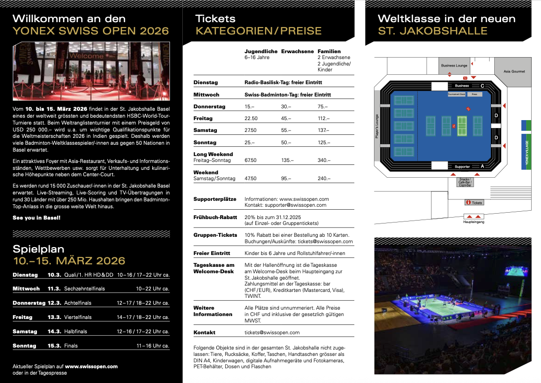 Das Yonex Swiss Open 2026 findet vom 10. bis 15. März in der St. Jakobshalle in Basel statt und gehört zu den bedeutenden internationalen Badmintonturnieren.