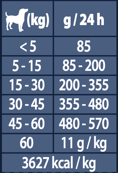 Nahrung schrittweise einführen: 5 Tage lang mit dem bisher verwendeten Futter mischen und danach separat bereitstellen. Die Tabelle mit den empfohlenen Tagesrationen stellt einen Richtwert für den Gebrauch des Produkts dar. Die Tagesration hängt von der Verfassung, dem Alter und der Fitness des Hundes sowie von der Jahreszeit ab. In den Sommermonaten ist die Portion herabzusetzen und im Winter zu erhöhen, um das Körpergewicht des Hundes zu halten.